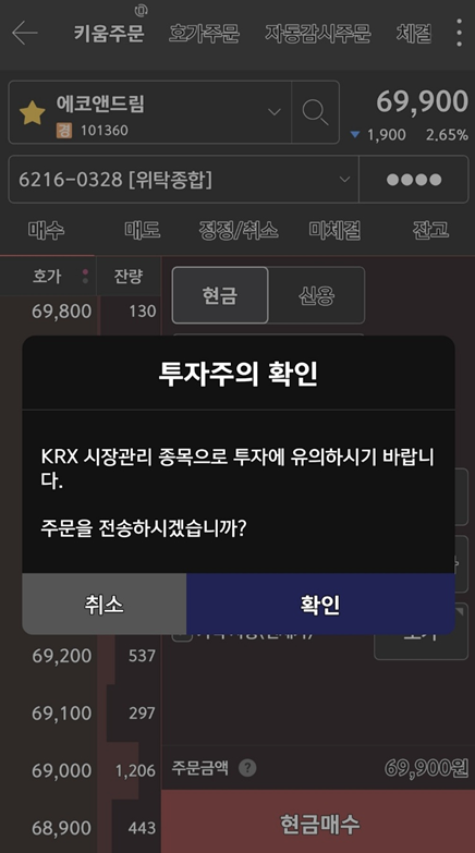 메시지가 뜨는 이유는 해당 주식이 시장관리 종목으로 지정되었기 때문인데 시장관리 종목은 주가가 급등하거나 급락하는 등 시장질서를 교란할 우려가 있는 종목을 말하더군요.